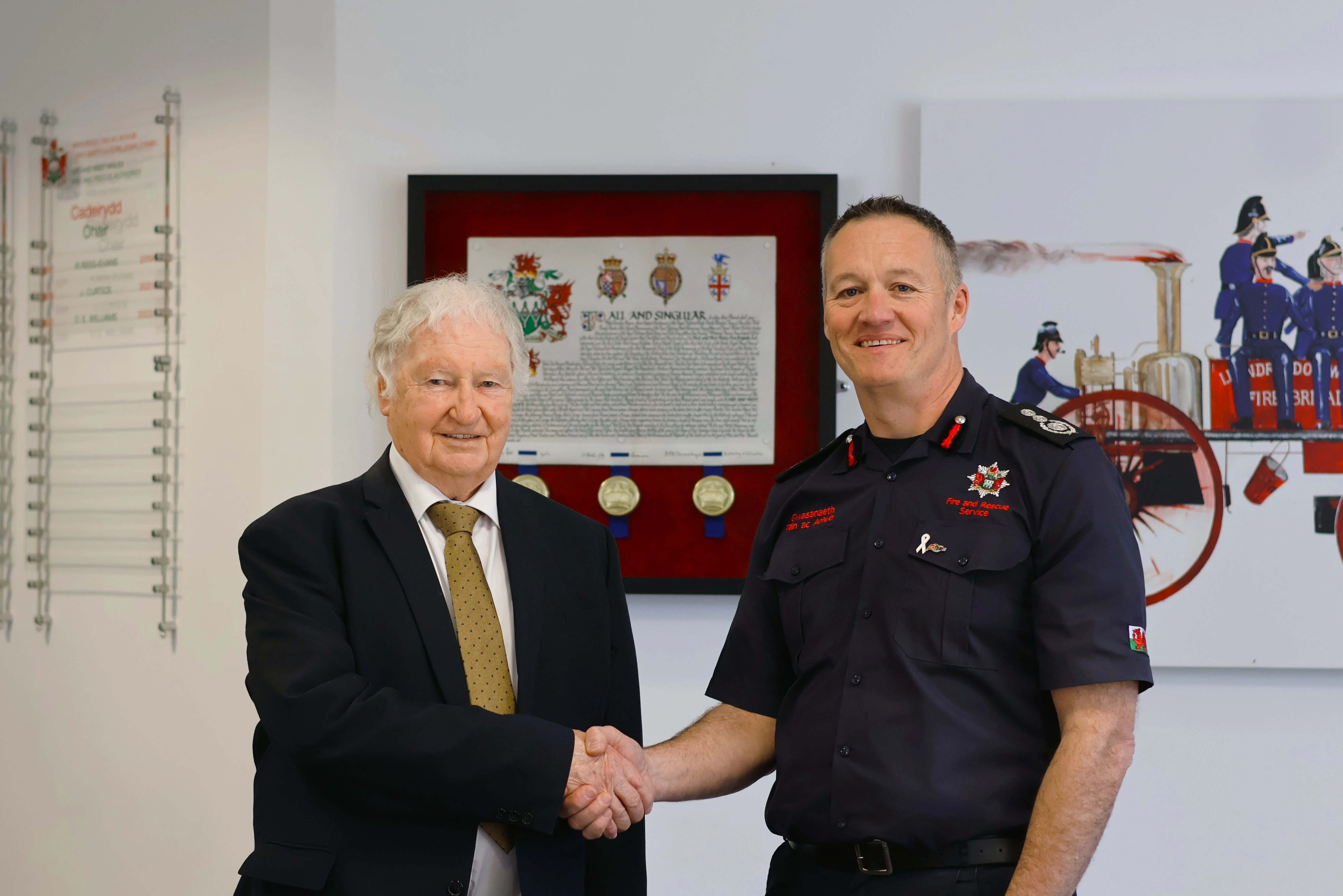 Ddydd Iau, Ebrill 2ail, roedd Gwasanaeth Tân ac Achub Canolbarth a Gorllewin Cymru yn falch o groesawu ei Brif Swyddog Tân cyntaf, Ronnie King OBE QFSM, i’w Bencadlys yng Nghaerfyrddin.