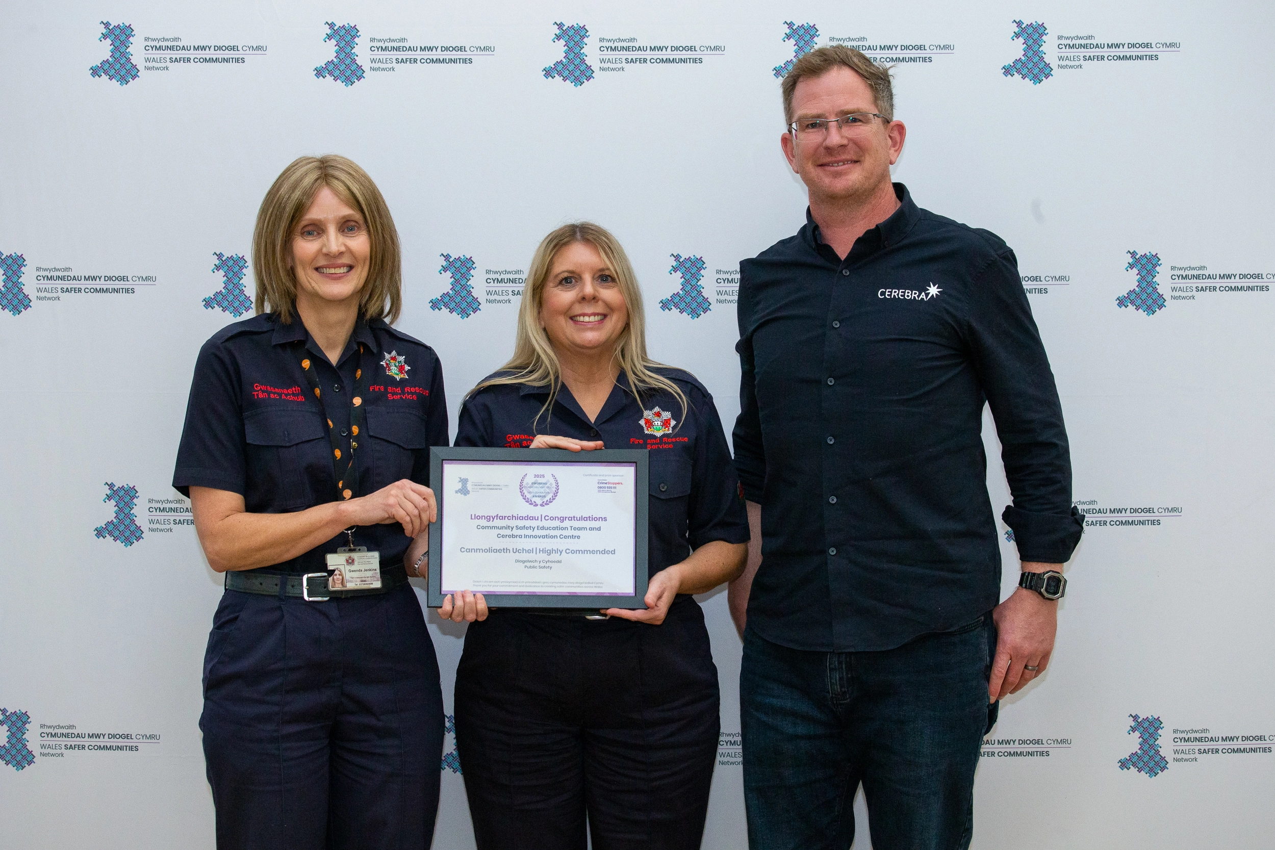Ddydd Iau, 27 Tachwedd 2025, enillodd aelodau o dîm Addysg Diogelwch Cymunedol Gwasanaeth Tân ac Achub Canolbarth a Gorllewin Cymru (GTACGC) a Chanolfan Arloesi Cerebra Wobr Canmoliaeth Uchel yng Ngwobrau Cymunedau Mwy Diogel 2025!
