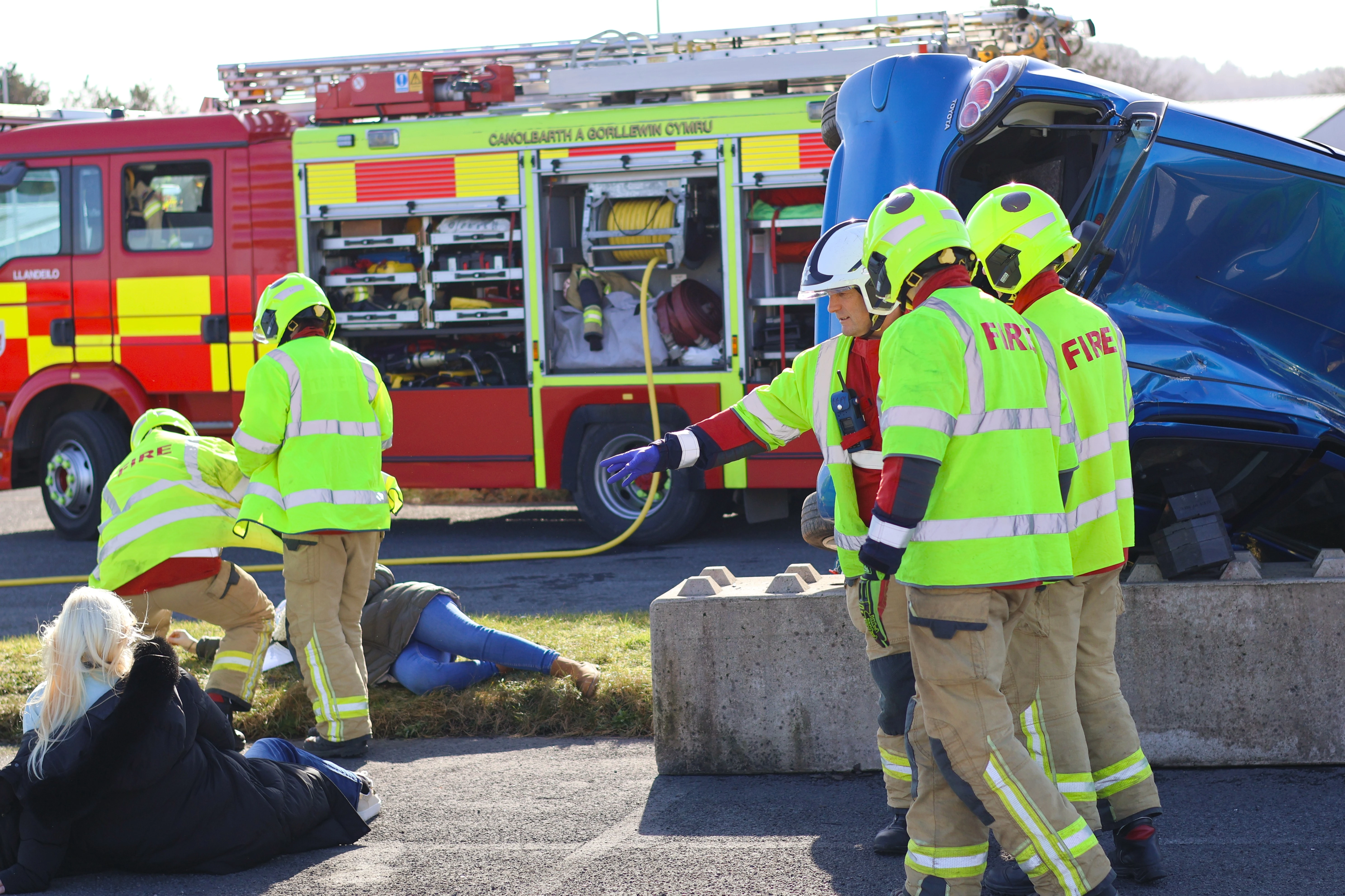 Roedd peiriannau tân a chriwiau o orsafoedd ar draws Adran y Gorllewin yn bresennol, gan gynnwys y Tymbl, Pont-iets, Llandeilo, Rhydaman, Caerfyrddin a Llanymddyfri a chafwyd cefnogaeth ychwanegol gan yr Ystafell Reoli Tân ar y Cyd a’r timau Cyflwyno Hyfforddiant a Chwilio ac Achub Trefol. Roedd Swyddogion Diogelwch Cymunedol hefyd wrth law, yn siarad ag aelodau'r cyhoedd a oedd wedi ymgasglu o gwmpas y digwyddiad ac yn rhannu negeseuon diogelwch ffyrdd allweddol ynghylch y 5 Angheuol.