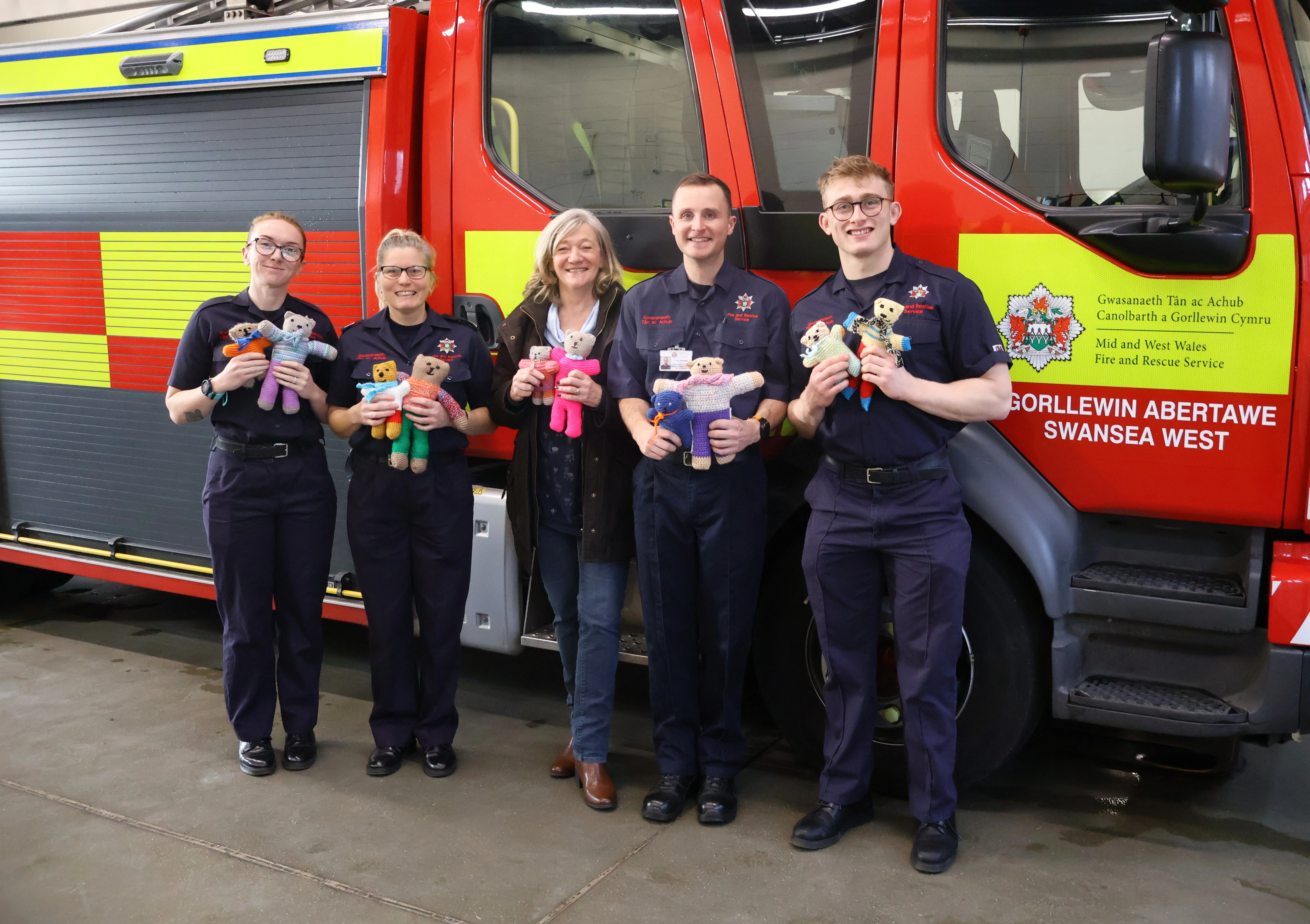 Firefighters at Swansea West Fire Station have recently received a collection of teddy bears that have kindly been made and donated by the local ‘Craft and Natter with Friends’ group. The group has around 30 members and meets monthly for relaxed and informal sessions at the nearby Woodman Pub in Blackpill. The group’s members work to create items for several good causes, including Project Linus UK, Special Care Baby Units, dementia charities and, most recently, Mid and West Wales Fire and Rescue Service (MAWWFRS). Jan Kerslake, a member of the group, recently visited Swansea West Fire Station to meet the crew and to donate the collection of bears that have been created.