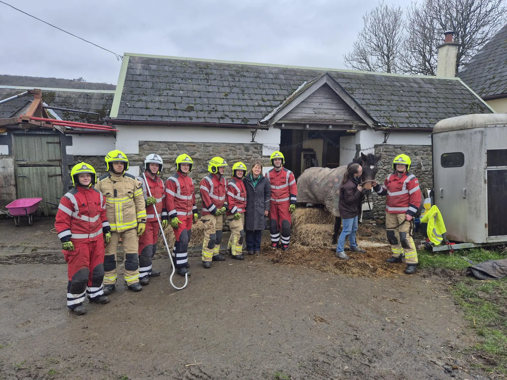 Gyda chymorth Holly Thomas o Cotts Equine Vets, gweithiodd y criwiau gyda'i gilydd i achub Floss yn llwyddiannus.