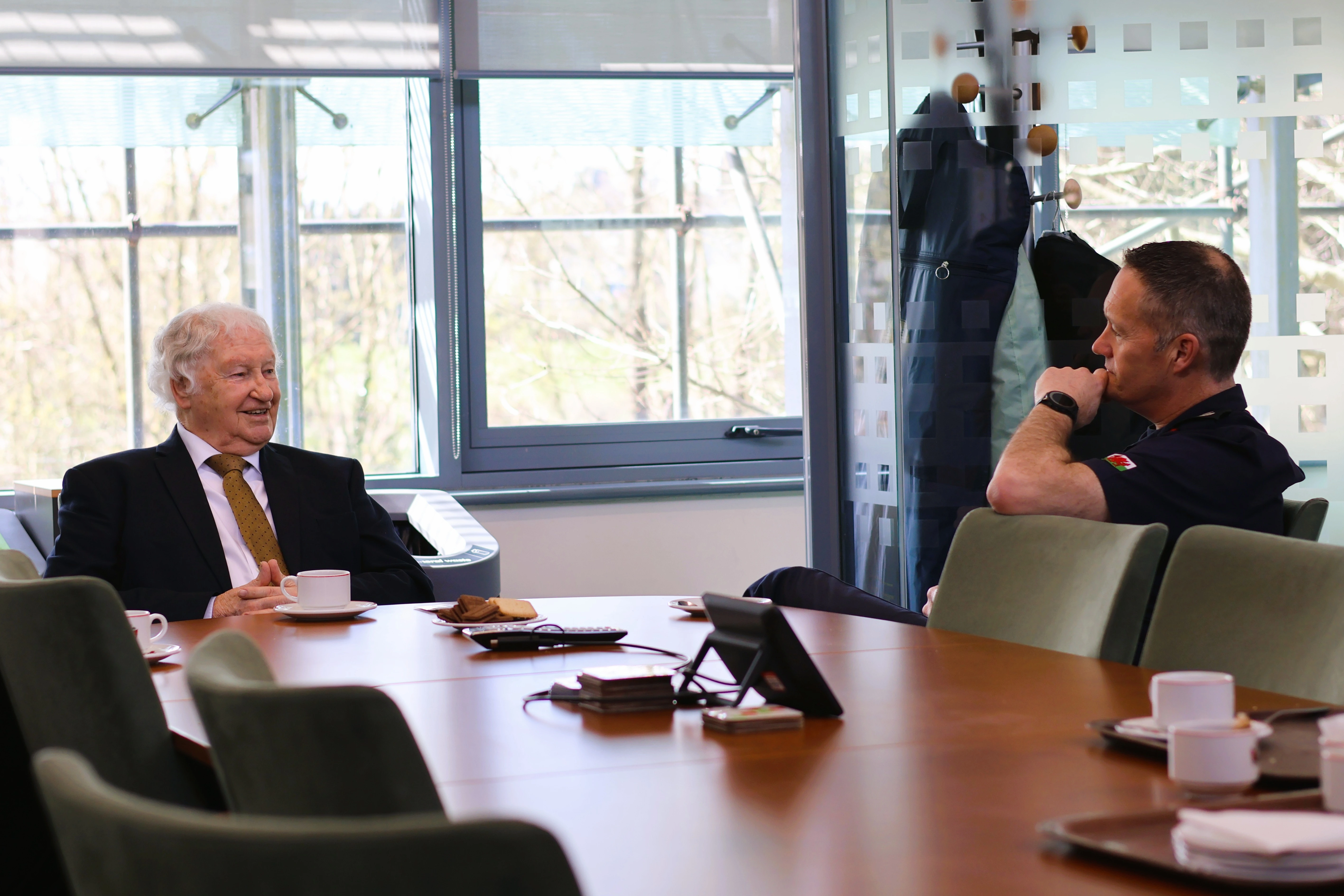 Yn ystod ei ymweliad, gwnaeth Mr King cwrdd â Phrif Swyddog Tân presennol y Gwasanaeth, Craig Flannery, y ddau ohonynt yn wreiddiol o Swydd Efrog, i drafod y datblygiadau o fewn y Gwasanaeth Tân ac Achub, uchafbwyntiau eu gyrfaoedd ac arweinyddiaeth.