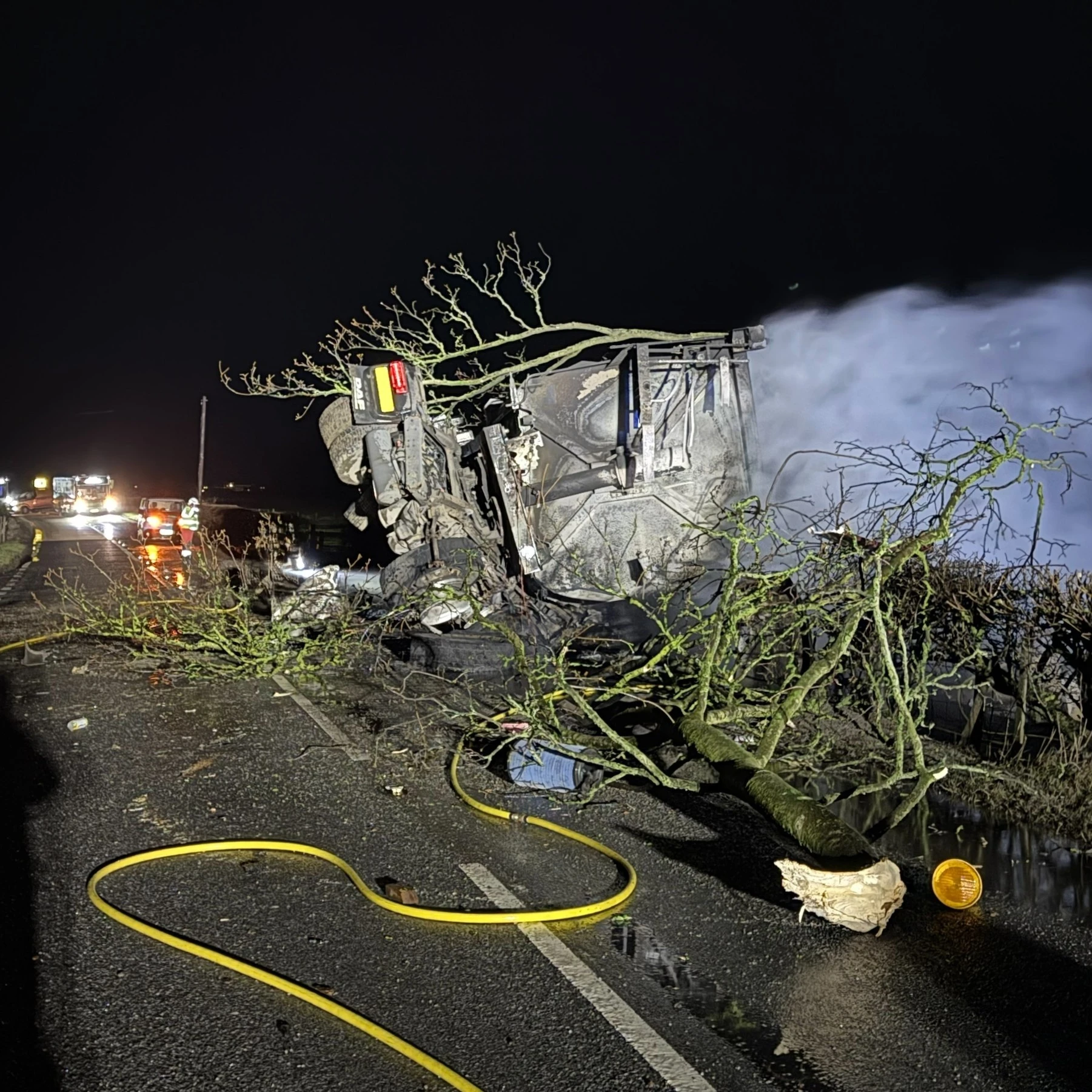 The crews responded to a road traffic collision involving one heavy goods vehicle. The vehicle had collided with a tree, overturned and subsequently caught fire. Four breathing apparatus sets, two hose reel jets and thermal imaging cameras were used to extinguish the fire. One casualty was conveyed to hospital by road ambulance.